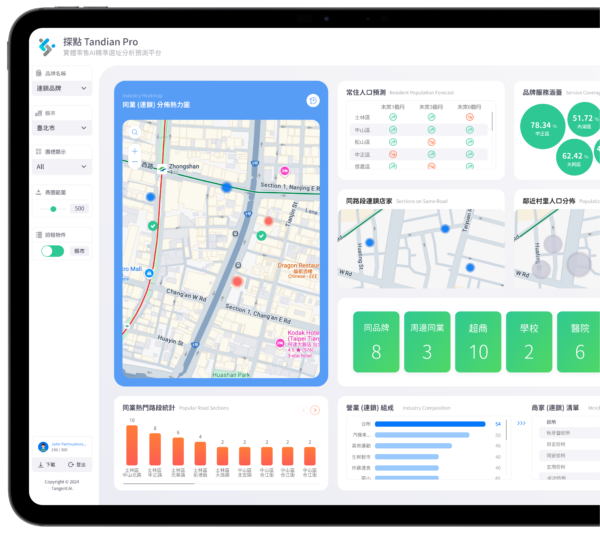「探點TanDian Pro」智能選址平台運用人工智慧技術,即時整合商圈數據與營收預測模型,提供高準確度的選址建議,幫助客戶快速做出決策。